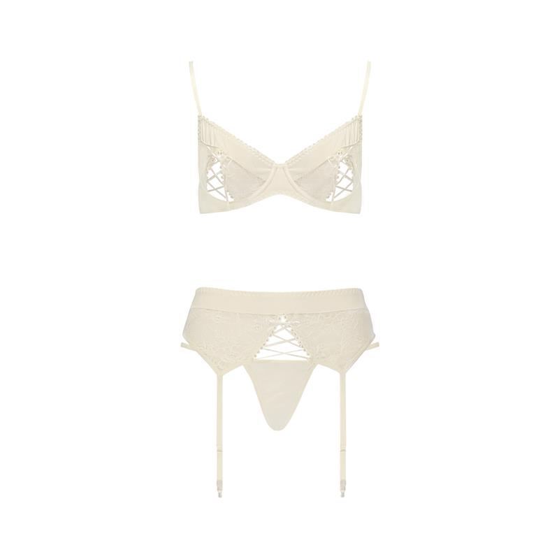 An elegant, sensual and erotic two-piece set. This set has a bra with the chest covered by silky white lace and a bow in the center that gives sensuality. The garter belt has the same pattern.