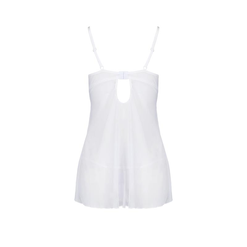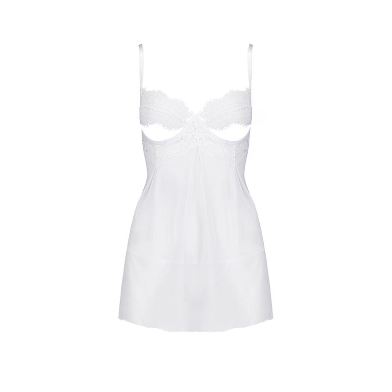 In this case, a chemise of a medium length, semi transparent and in an off-white color. The part of the bra has open cups and floral details with lace that will not leave anyone indifferent.